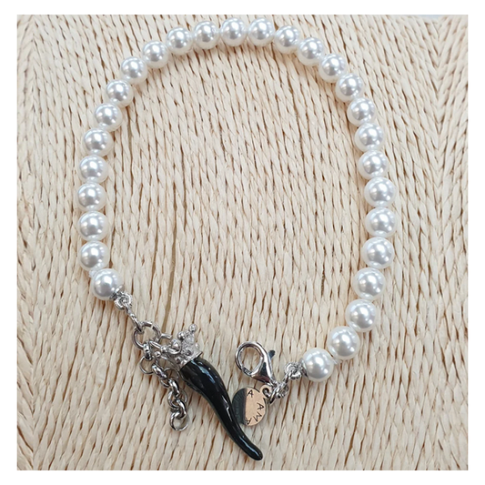 Bracciale scaglie ematite con cornetto smaltato bianco in argento - BRSCCOBIA.BIA
